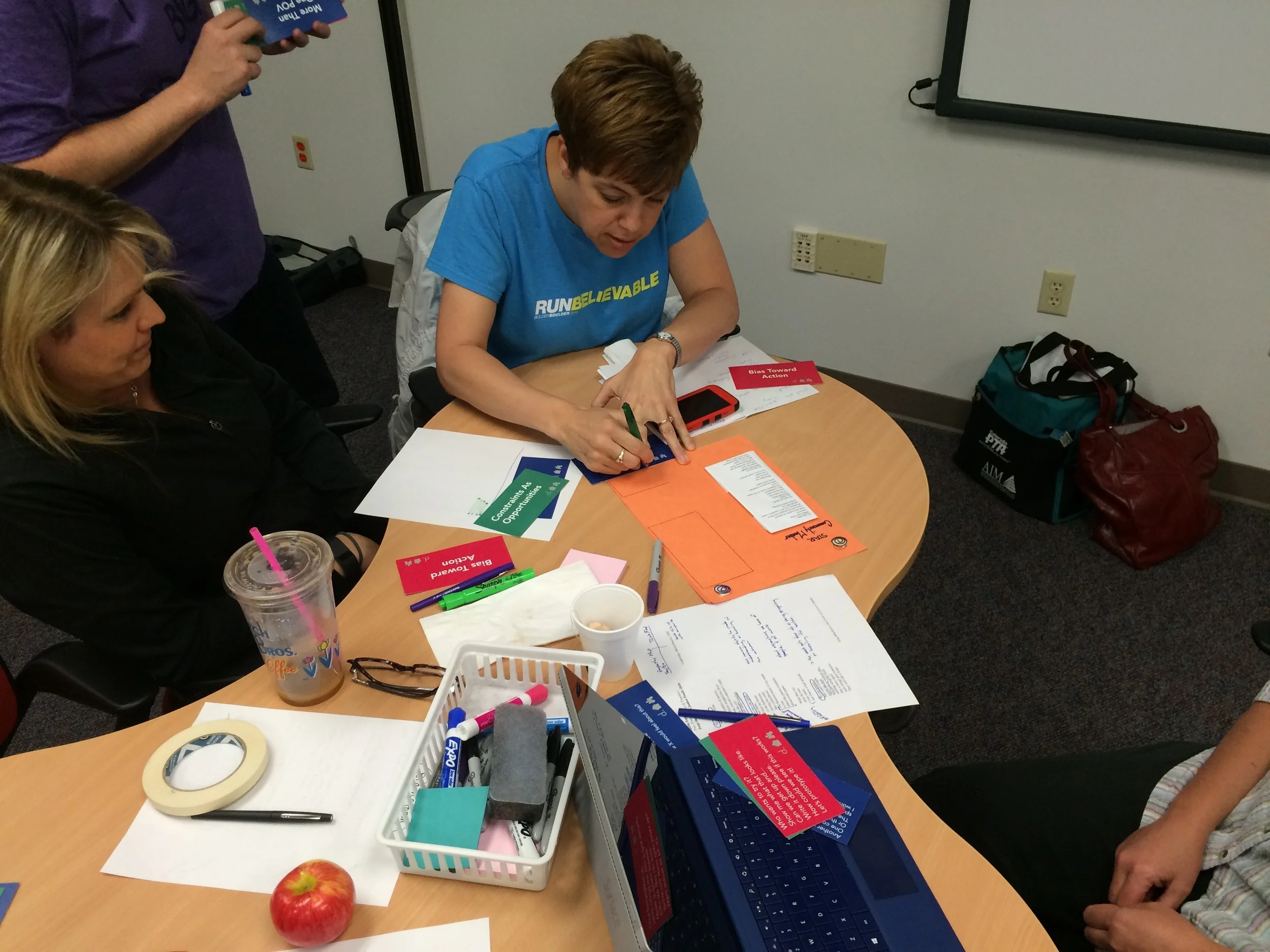Adapt it: At this point in the workshop the Stanford team introduced mindset referees who blew a whistle each time a mindset that helps overcome barriers was recognized: 1) bias towards action, 2) constraints and opportunities, 3) different point of view. With less staff resources and after receiving the feedback from the Stanford team that the referee whistles were a little jarring we adapted this portion as well and had the participants and facilitators note and track when one of the 3 mindsets was used without the referee whistle. We looked for examples of mindsets in action at different points throughout the day to reflect on how we were doing as a group.