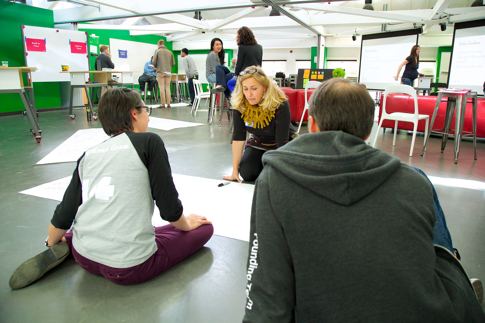 But what about the “broken escalator theory” from the morning? Participants were asked to identify the potential barriers or “broken escalators” to their action plan on large butcher paper. In closing, teams stood at the bottom of the d.school stairs, declared their next steps, and shared the potential barriers or “broken escalators” from their butcher paper. One by one, teams ran up the stairs and broke through their butcher paper. Check out this quick video of the action.