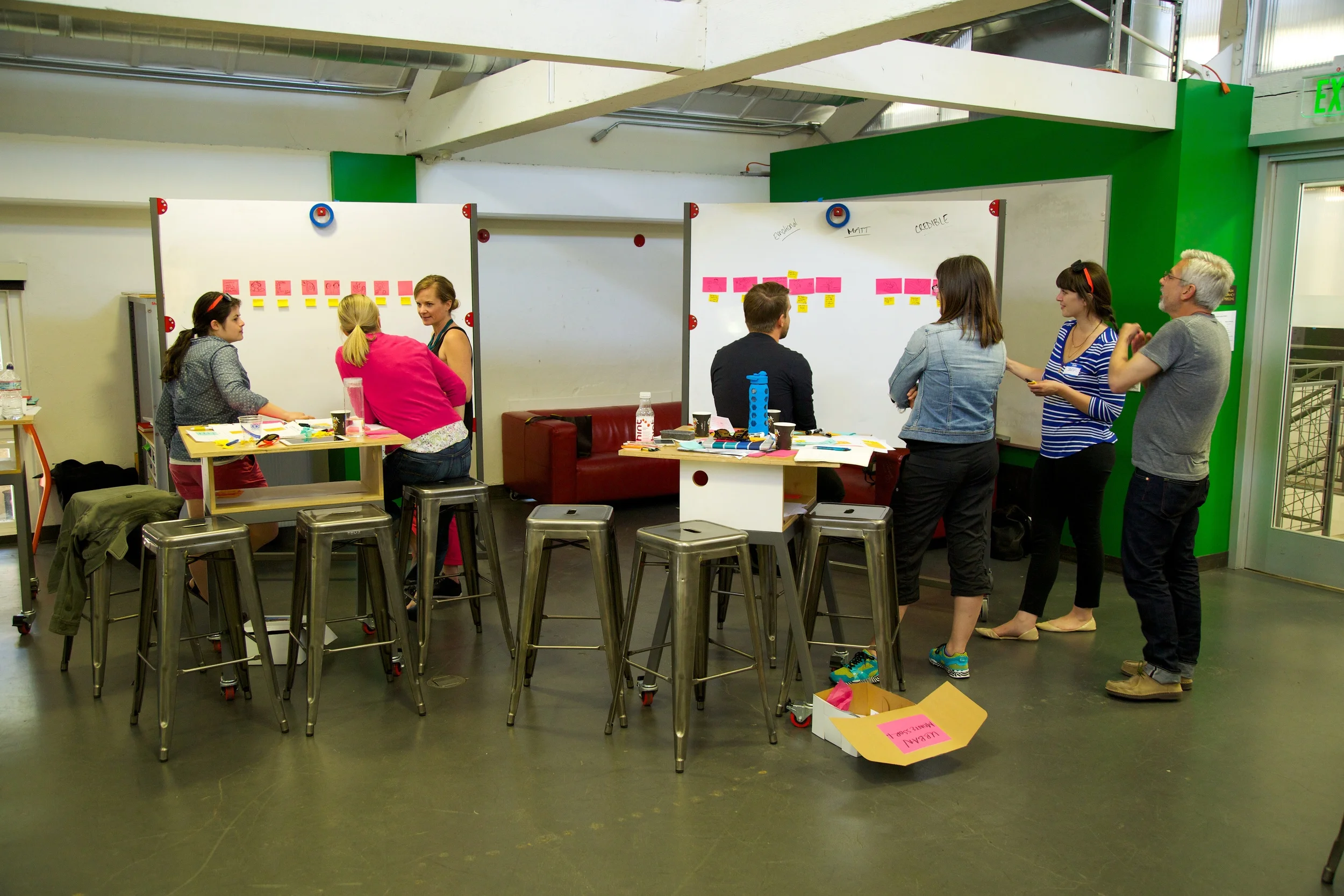 After lunch, Seamus led us into workshop mode – all in the name of making a sticky and structured story. He guided us through a series of exercises that mirrored the design process and were inspired by the book, Made to Stick. We defined an audience by creating profiles, narrowed our story ideas from a full page story down to an itty bitty corner of a sheet, and made the story version of a How Might We statements. We then added detail and structure back into the story through the frame of “facts, feelings, and fireworks.” You can access all these resources on our wiki here. Each team drew visuals to accompany their fact, feeling, and firework phrases, and those visuals along with the phrases went in linear order on whiteboards to form a visual storyboard.